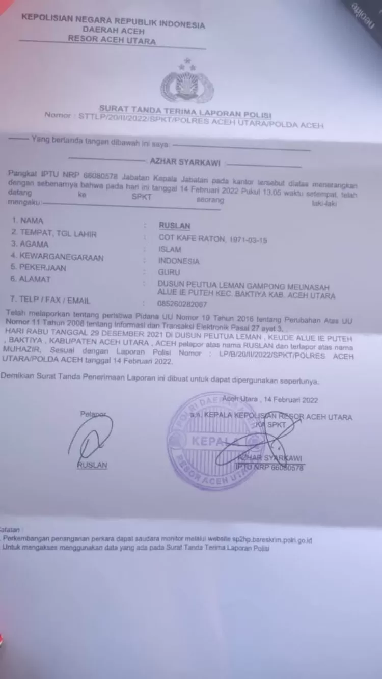 Berdasar Laporan Polisi Nomor STTLP/20/II/2022/SPKT/POLRES ACEH UTARA/POLDA ACEH tentang Informasi dan Transaksi Electronik pasal 27 ayat 3. Pria beinitial MUH warga Kecamatan Seunuddon itu dilaporkan oleh Ruslan seorang kepala Sekolah di Aceh Utara terkait beberapa unggahan berita melalui media Sosial Online dan media Whatsapp yang dikirim ke Hp Ruslan oleh Oknum MUH.