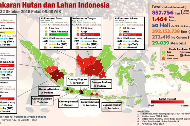 Sementara itu, Data BNPB hari ini (22/10), pukul 08.00 WIB mencatat masih terjadi karhutla di sejumlah wilayah di Indonesia. Titik panas atau hot spot teridentifikasi di enam provinsi yang menjadi perhatian BNPB, yaitu Sumsel 153 titik, Kalteng 44, Kalsel 23, Kalbar 5, dan Jambi 2. Data tersebut berdasarkan citra satelit modis-catalog lapan pada 24 jam terakhir. Masih adanya titik panas berpengaruh terhadap kualitas udara di wilayah terdampak. Data kualitas yang diukur dengan parameter PM 2,5 mengindikasikan kualitas pada tingkat baik hingga tidak sehat.