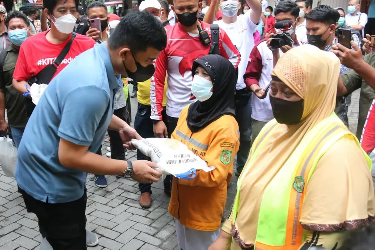MEDAN - realitasonline.id | Wali Kota Medan, Bobby Nasution menyerahkan bantuan bahan pokok kepada petugas kebersihan dan komunitas masyarakat di Komplek Asia Mega Mas, Minggu (12/9/2021).