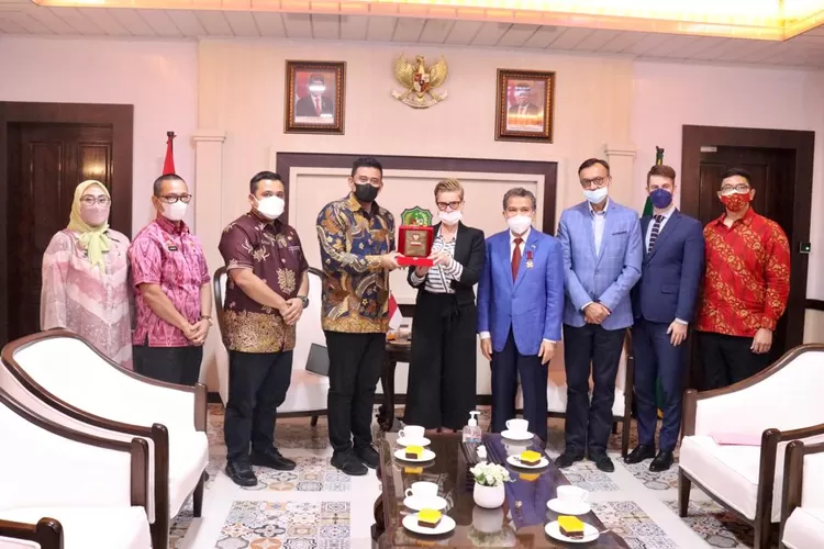 MEDAN - realitasonline.id | Wali Kota Medan Bobby Nasution terlihat memakai kemeja batik biru terang saat menerima kunjungan Dubes Polandia, Beata Stoczynska, Kamis (7/10/2021) di ruang khusus wali kota. Kemewahan baju batik itu terpancar sangat kuat saat Bobby menerima tamunya yang akan melakukan penjajakan kerjasama antara Pemko Medan dan Polandia.