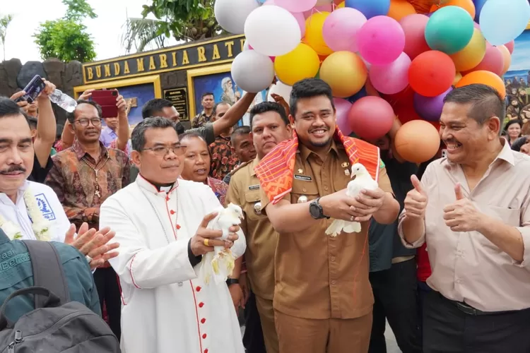 MEDAN - realitasonline.id | Wali Kota Medan Bobby Nasution meresmikan Gua Ratu Segala Bangsa Ulang Tahun ke-25 dan Pesta Perlindungan Paroki St Fransiskus Assisi Padang Bulan di Gereja Khatolik Paroki St Fransiskus Assisi Padang Bulan Medan Jalan Bunga Ester, Selasa (4/10). Dihadapan seluruh jemaat yang hadir, menantu Presiden Joko Widodo ini mengajak untuk mendukung program Pemko Medan, terutama mewujudkan Rumah Ibadah Mandiri.