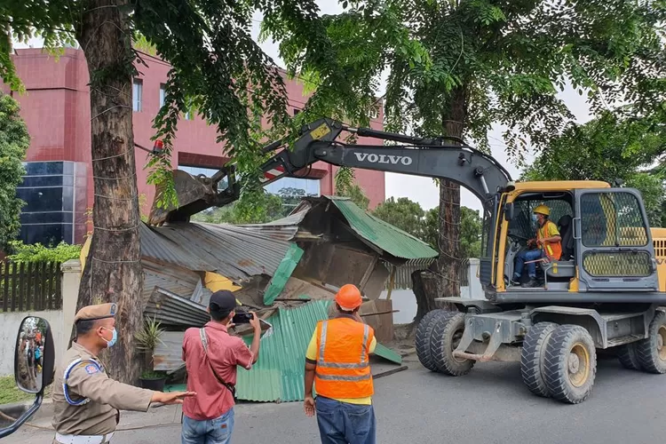 alat berat berupa beko dari Dinas Pekerjaan Umum. Setelah merobohkan bangunan itu, petugas membersihkan lokasi pembongkaran. Sisa-sisa material pembongkaran diangkat ke truk untuk diangkut ke tempat pembuangan.