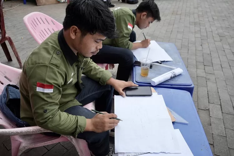 Mereka menggambar di atas kertas dengan menggunakan pinsil. Tanpa kanvas juga cat. Mereka tampak menggambar sesuai dengan bentuk asli bangunan itu.