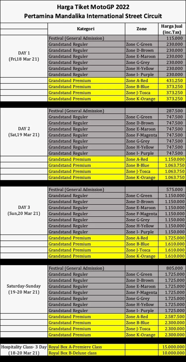 Ribuan tiket telah terjual habis di Tiketapasaja.com hingga penjualan tiket resmi ditutup pada tanggal 11 Maret 2022 lalu. Berbagai kategori tiket antara lain adalah kategori Hospitality (3 day pass) yang terdiri dari Premiere Class, Deluxe Class, Weekend Pass (2 day pass) untuk zona A, B, C, D, E, F, G, H, I, J Festival, dan tiket Day 3 (1 day pass) untuk zona A, B, C, D, E, F, G, H, I, Festival (Lihat tabel).