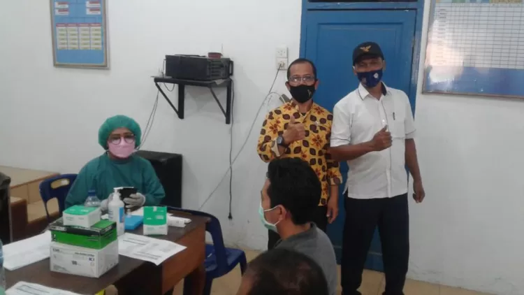 Kepala Desa Sei Rotan Suwandi MS bersama Sekdes Suwarman S Sos serta Ketua BPD H Irwansyah menyaksikan pelaksanaan vaksinasi yang dilakukan oleh tim medis dari Puskesmas Bandar Khalifah Percut Sei Tuan.